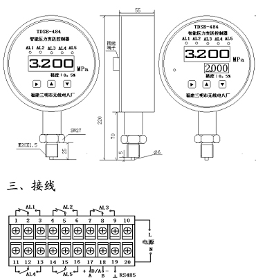 TDSB-484ZL系列壓阻式智能數(shù)顯壓力變送器、控制器是集壓力測量、顯示、控制于一體的多功能產(chǎn)品。該產(chǎn)品為全電子數(shù)字技術(shù)。結(jié)構(gòu),前端采用帶隔離膜充油芯體的壓阻式壓力傳感器,輸出信號(hào)由高精度、低溫漂和高可靠性的放大電路轉(zhuǎn)換為標(biāo)準(zhǔn)信號(hào)。它使用方便,參數(shù)在儀表盤面設(shè)定,廣泛應(yīng)用于電力、自來水、水處理、石油、化工、冶金等行業(yè),對流體介質(zhì)的壓力進(jìn)行監(jiān)控,是指針電接點(diǎn)壓力表的理想替代產(chǎn)品。
