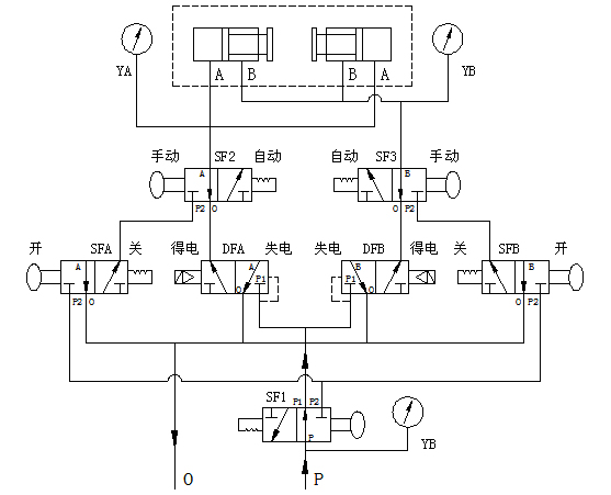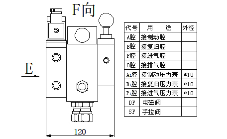 自動剎車:電磁閥線圈處于失電狀態(tài),手拉閥SF1、SF2、SF3往里推至自動狀態(tài),過濾后壓縮氣體從進氣腔(P腔)進入集成塊。當接收到停機指令時,制動電磁閥DFA得電開閥,使壓縮氣體進入制動腔(A腔), 從而實現(xiàn)對制動器的投入, 加速機組的制動停機;