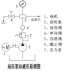 電動機通過聯(lián)軸器直接帶動齒輪泵泵油,壓力油經過溢流閥調節(jié)通往單向閥到達四通集成塊,分別供給壓力表、調節(jié)截止閥和用油對象供油;